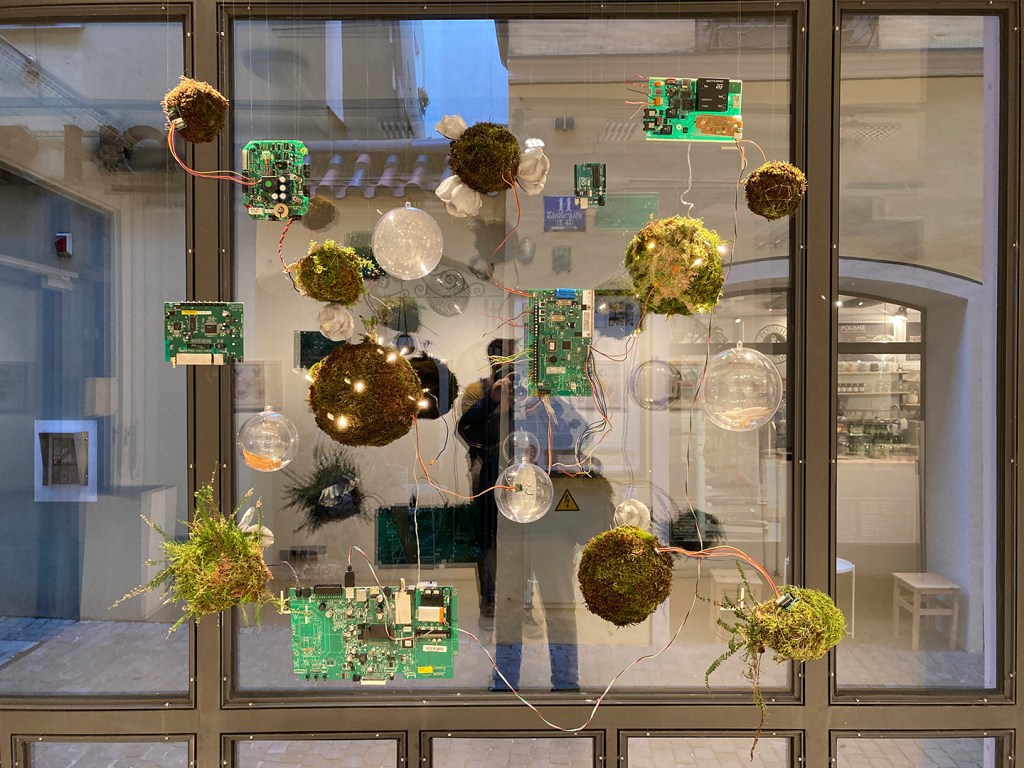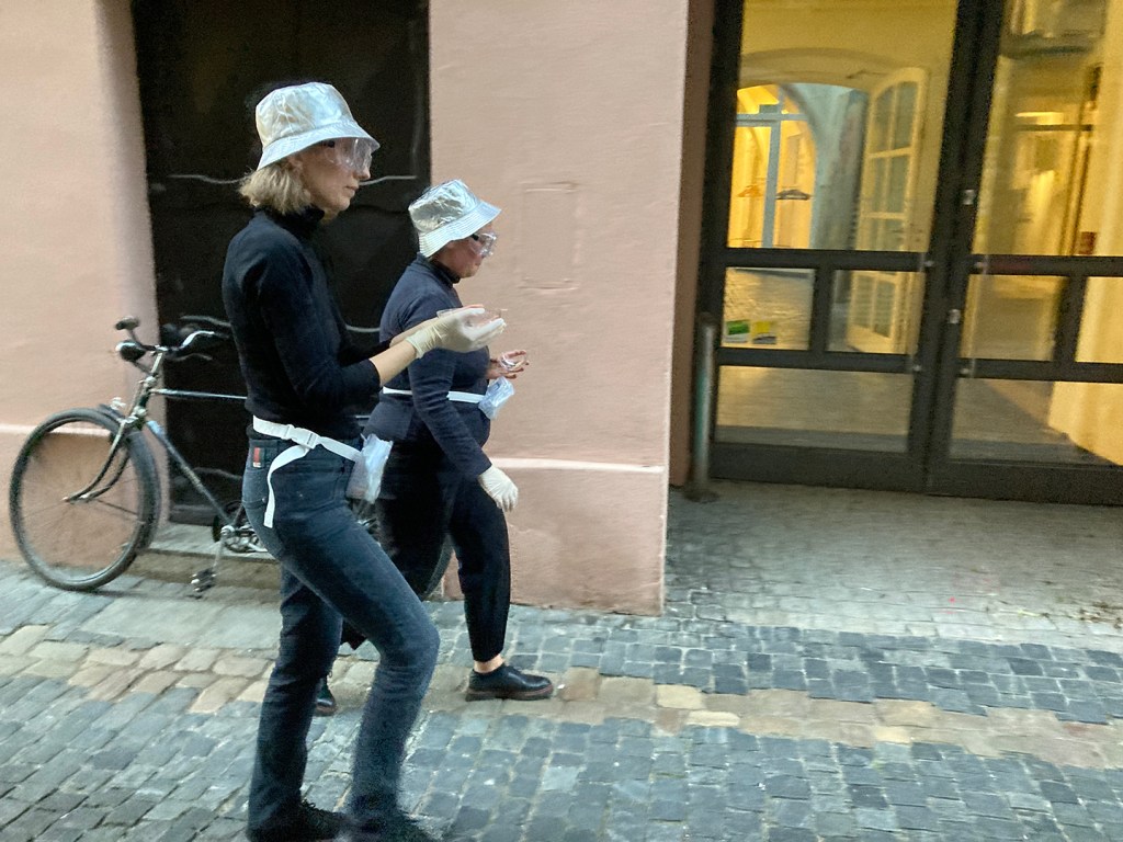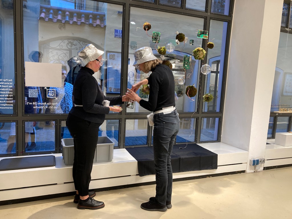 The performers went out into the street, inspected the nearby surroundings collecting small pieces of garbage from the ground and transferred them into the installation´s transparent decomposting-spheres.